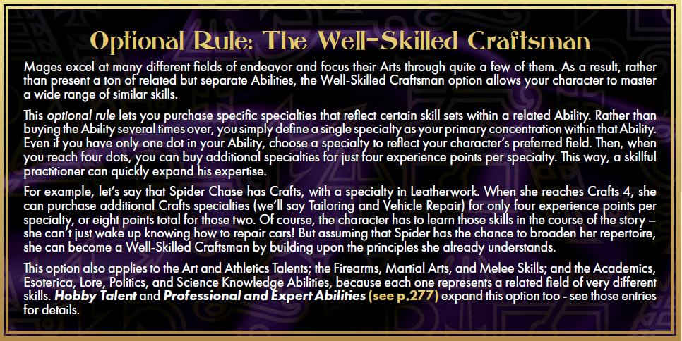 We use the Well-Skilled Craftsman optional rule from Mage 20 (Corebook, Pg 279).