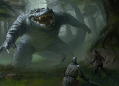 A great, hulking alligator Chimera that stalks the Silver Road. Waiting for anyone foolish enough to step off the path and into her waiting jaws. She's about the size of two school buses, including her massive tail, the swishing movements of the scaly tail shake the very waters she treads.